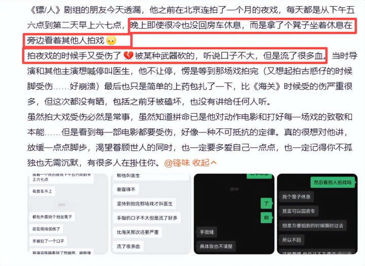 网上爆料称,有《镖人》的工作人员透露,谢霆锋在拍戏的时候手不小心被武器砍出了血,但是导演和其他主演都想喊停找医生,可谢霆锋却硬撑着不让,愣是等到那场戏拍完,最后只是简单的包扎了一下。