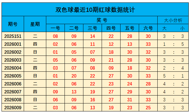 上期红球大小比为3:3,近10期大小比为31:29;总体上大奖号走势稍热,本期关注大数较上期走势保持,推荐大小比为:3:3