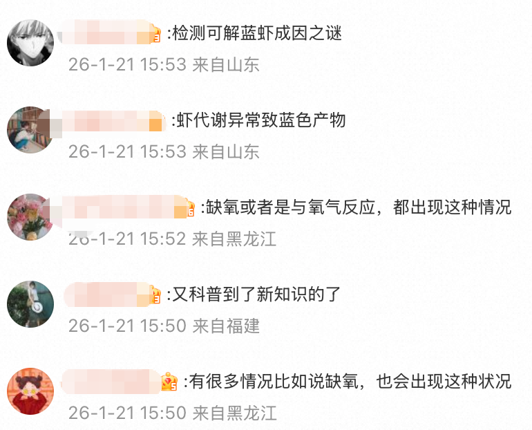 而在下面网友们的回复中,也有不少热度较高的回答表示:“如果局部有高浓度铜离子污染,虾在养殖阶段就难以存活,概率低。”“单只出现蓝色更可能是代谢差异而非化学污染。”“应该是和虾的生长环境有一定关系的自然现象。”
