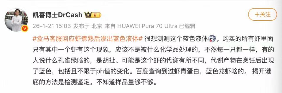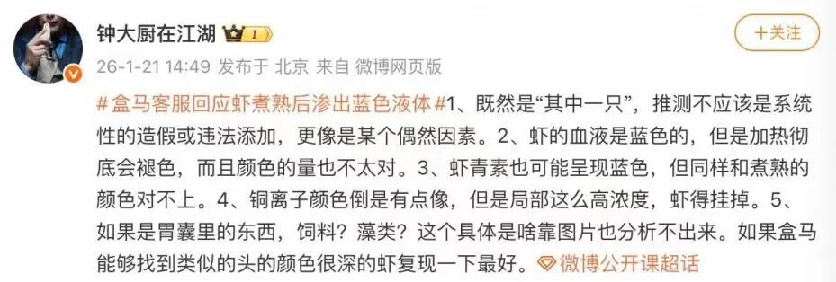 1月20日,上海的王女士称,在盒马网购了斑节虾,结果煮出来后发现其中一只“蓝得吓人”。客服回复王女士称,虾发蓝跟多种环境影响因素有关。此话题在网上引起热议。