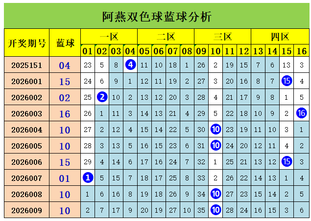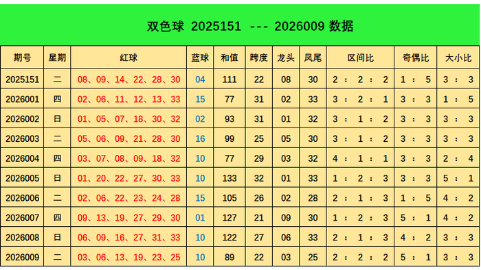 上期回顾:双色球第2026009期开出奖号:红球03、06、13、19、23、25;蓝球10,其中红球三区比为2:2:2,奇偶比5:1,大小比为3:3,蓝球开出1路号码10。