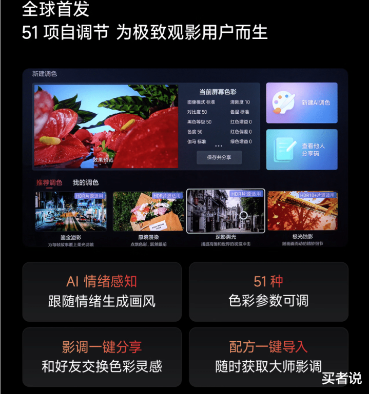 控光控色精度贫穷:匹配自研的信芯AI画质芯片H7,搭配光色同控算法,贬责算力指数级增长的挑战。