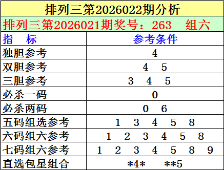 开奖回顾:排列三第2026021期开出奖号:263。其中奖号大小比为1:2,奇偶比为1:2,012路比为2:0:1,和值为11,跨度为4。