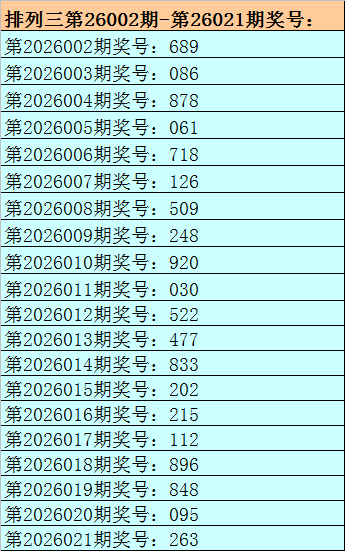 1.排列三最近十期分别开出号码:522-477-833-202-215-112-896-848-095-263,其中有3期奖号开出了上期的重复号码,本期预计第2026021期奖号:263中有重号,参考号码:3。