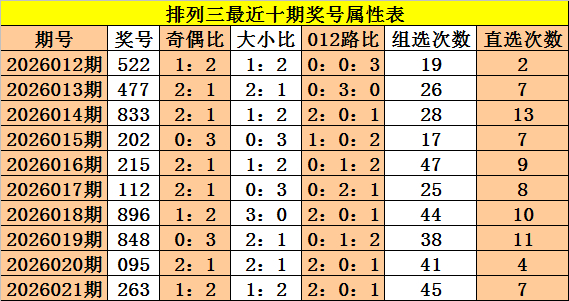 上期回顾:体彩排列三第2026021期奖号:263,奇偶比1:2,大小比1:2,012比2:0:1。