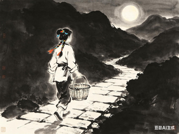 今昼夜里,明月提着竹篮,踩着山间的石板路往山顶走。