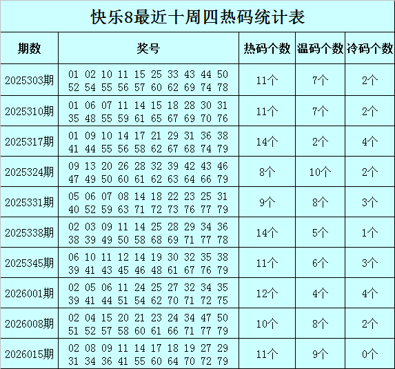 福彩快乐8第2026015期(上周四)开奖回顾:02 08 09 11 14 17 18 19 27 29 31 34 36 41 55 60 64 70 72 79,其中奖号遗漏总值为47,冷温热码比为0:9:11。