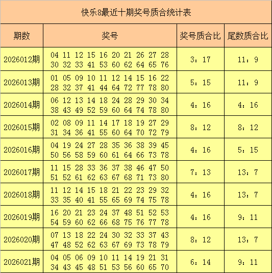 福彩快乐8第2026021期开出奖号:04 05 06 09 10 11 14 19 21 31 34 43 45 48 51 53 56 60 65 70,其中奖号质合比为6:14,奖号尾数质合比为9:11。