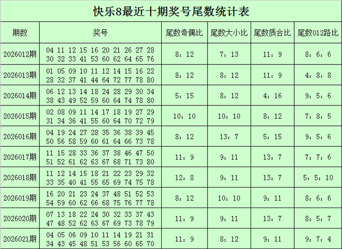 福彩快乐8第2026021期开奖回顾:04 05 06 09 10 11 14 19 21 31 34 43 45 48 51 53 56 60 65 70,其中奖号尾数奇偶比为11:9,尾数012路比为9:7:4,尾数大小比为8:12,尾数质合比为9:11。