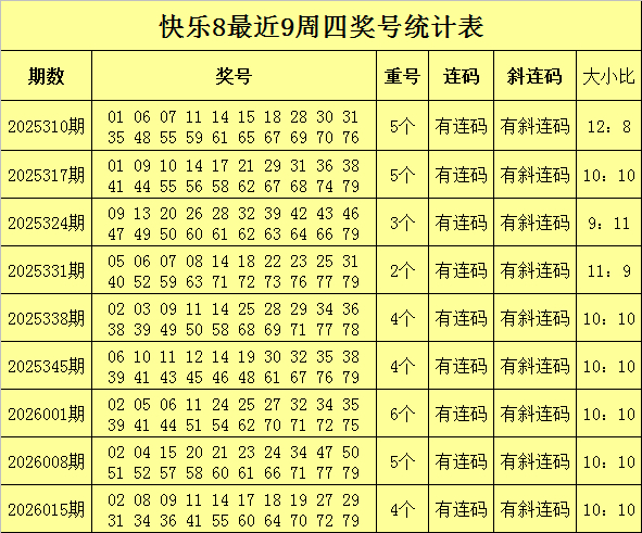 福彩快乐8第2026015期(上周四)奖号回顾:02 08 09 11 14 17 18 19 27 29 31 34 36 41 55 60 64 70 72 79,其中大小比为7:13,包含4个重号02、34、60、79,包含连码08 09、17 18 19。