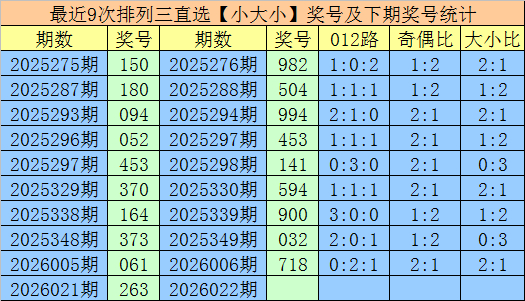 1.排列三第2026021期奖号开出263,大小直选分布为:小大小,在历史开奖中直选【小大小】分布已开出944期,在前9次直选【小大小】分布中,出现奖号为:150-180-094-052-453-370-164-373-061,组三开出1期,组六开出8期。