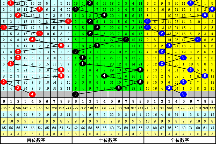 3.在以上9期奖号中,号码012路比分别开出1:0:2、1:1:1、2:1:0、1:1:1、0:3:0、1:1:1、3:0:0、2:0:1、0:2:1,012路出现个数比为11:9:7,本期预计开出012路比1:1:1。