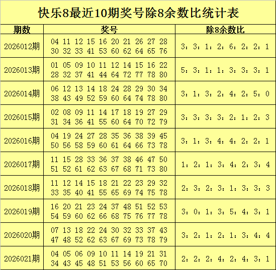 福彩快乐8第2026021期开奖回顾:04 05 06 09 10 11 14 19 21 31 34 43 45 48 51 53 56 60 65 70,其中奖号除8余数比为2:2:2:4:2:4:3:1。